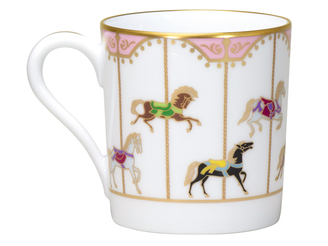 メリーゴーランドの中の9頭の木馬が、それぞれに異なる表情を見せて楽しく飛び回る様を、色とりどりの上絵と金彩により表現しています。