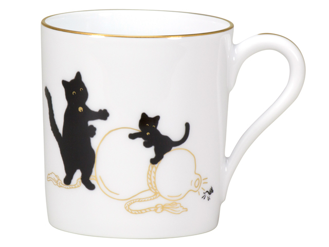 しなやかで動きのある黒猫のシルエットと、シンプルな金線でデザインされた縁起物のモチーフを組み合わせた福を感じるマグです。