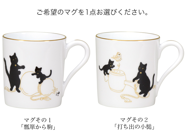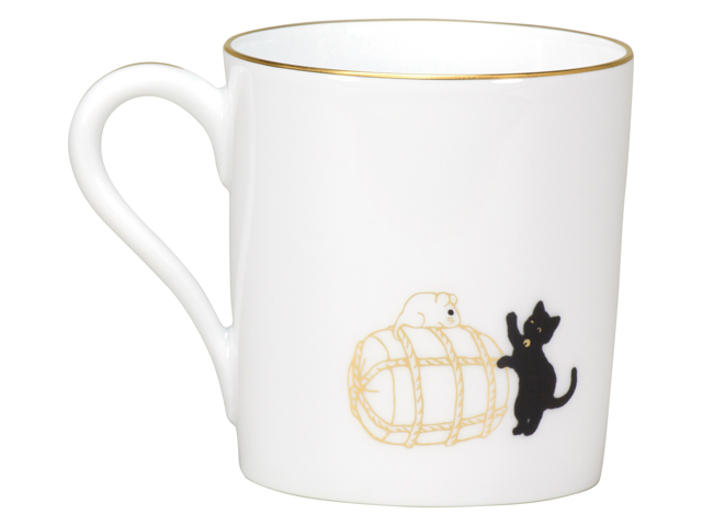 しなやかで動きのある黒猫のシルエットと、シンプルな金線でデザインされた縁起物のモチーフを組み合わせた福を感じるマグです。