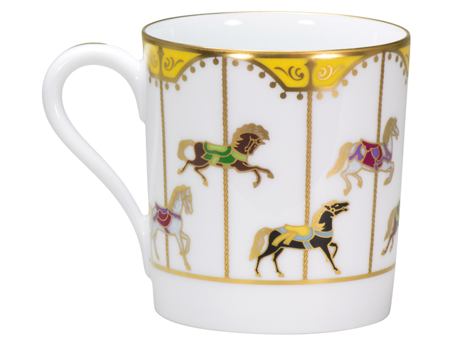 メリーゴーランドの中の9頭の木馬が、それぞれに異なる表情を見せて楽しく飛び回る様を、色とりどりの上絵と金彩により表現しています。