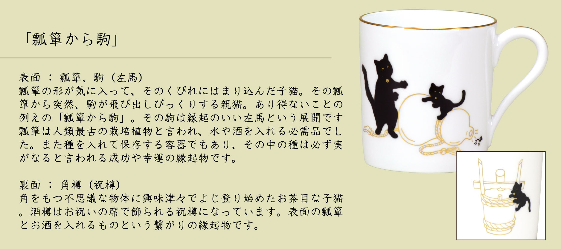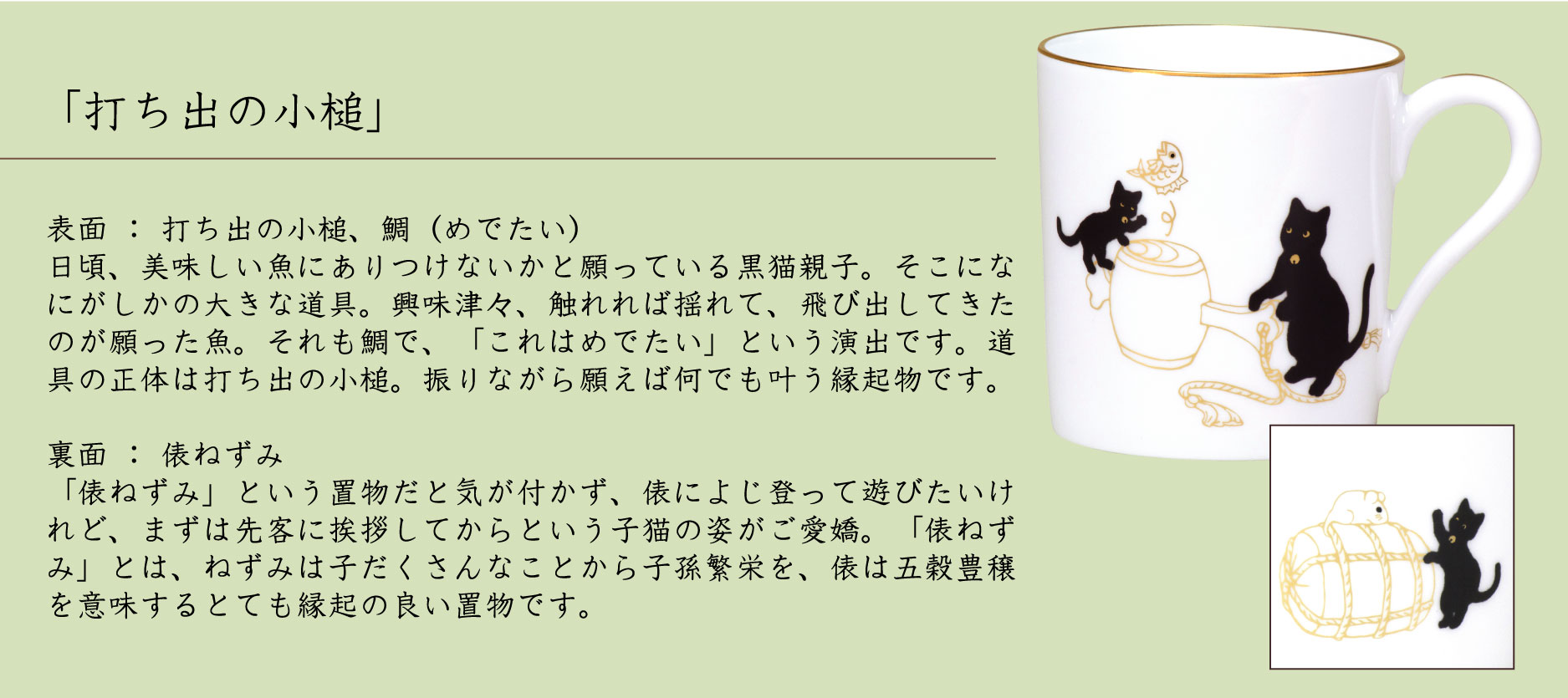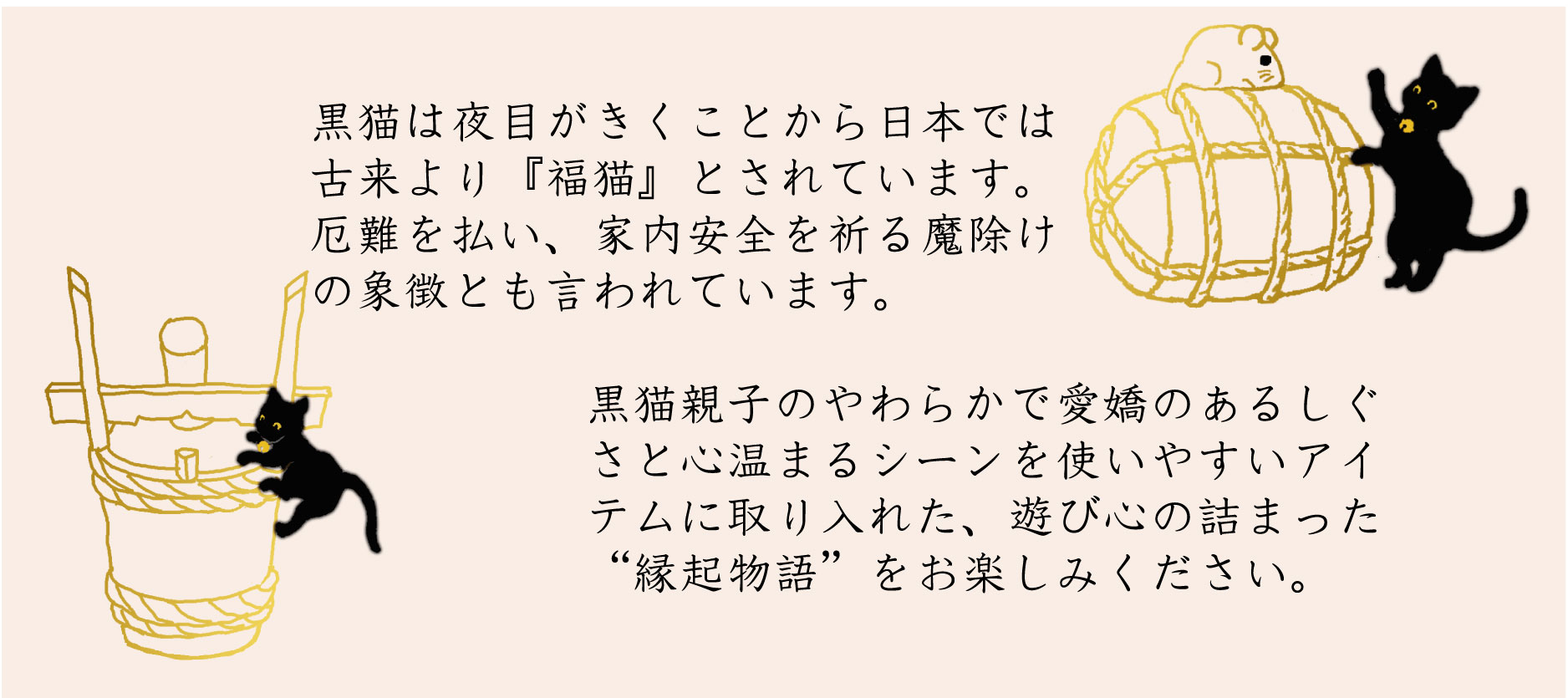しなやかで動きのある黒猫のシルエットと、シンプルな金線でデザインされた縁起物のモチーフを組み合わせました。