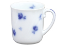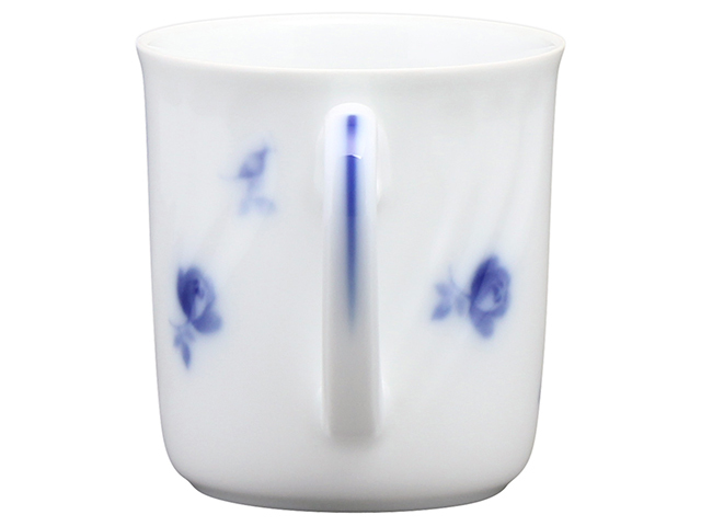 大倉陶園ならではの岡染めブルーの濃淡で蕾から花開く愛らしい姿のバラを写したマグです。