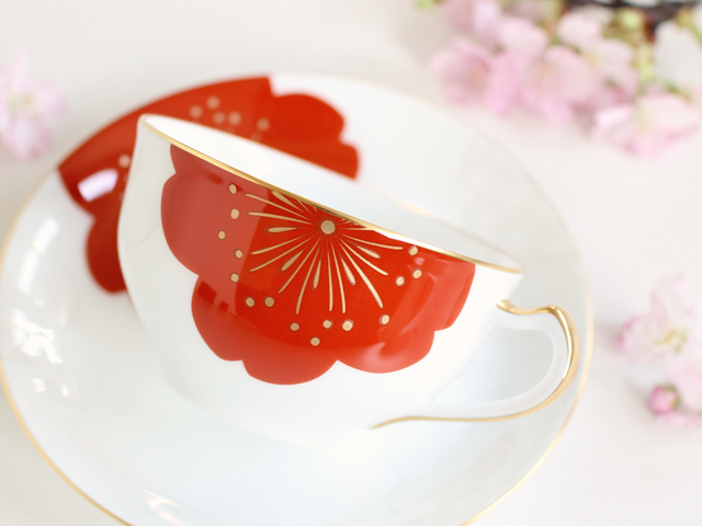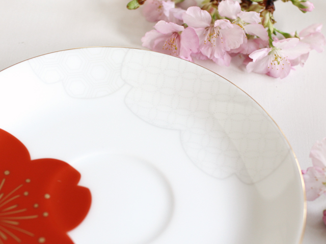 紅色の桜のしべには金彩を繊細に施し、日本伝統の吉祥文様をモダンな印象に仕上げました。