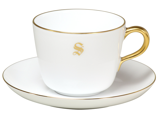 オークラホワイトと賞賛されている美しい白磁に金のイニシャルが映える洗練されたシンプルな器です。