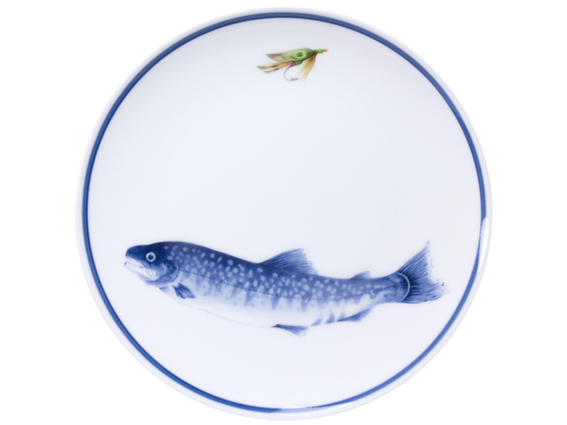 美しく繊細に描かれた上絵付けのフライと、呉須で優しく描かれたイワナのロマン溢れる逸品で