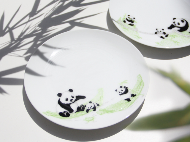 幸せを運ぶパンダ親子とラッキーモチーフとの出会いのシーンを、遊び心たっぷりに生き生きと写し取りました。