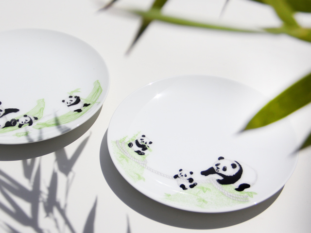 幸せを運ぶパンダ親子とラッキーモチーフとの出会いのシーンを、遊び心たっぷりに生き生きと写し取りました。