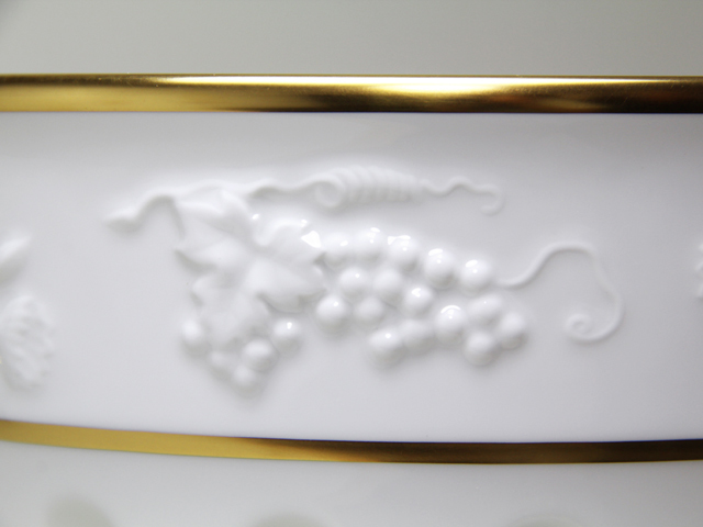 大倉陶園では金彩が施されている全ての商品に、ほぼ24金に近い純度の高い金を使用しております。そのため、品のある輝きを見せます。