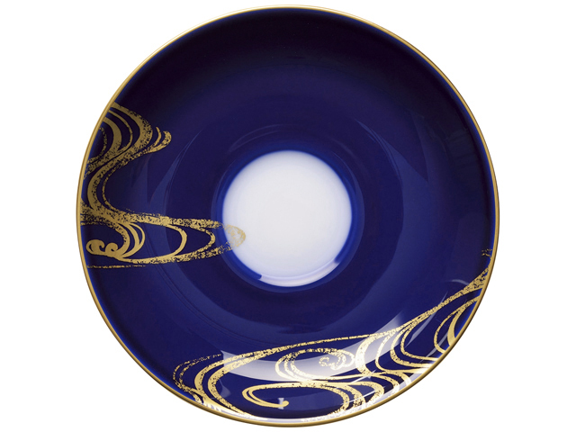 ソーサーには瑠璃地に金彩で流水紋を、カップには手描きで杜若の花姿を描き、爽やかな初夏の風に揺れ水辺に咲く情景を表現しました。
