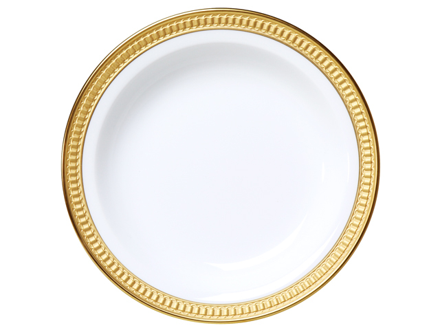 細かな模様が表情豊かに語りかける「クラウン」。大倉陶園の白磁の美しい白さゆえに引き立つ金の縁飾りが、品良くテーブルに輝きを添えます。